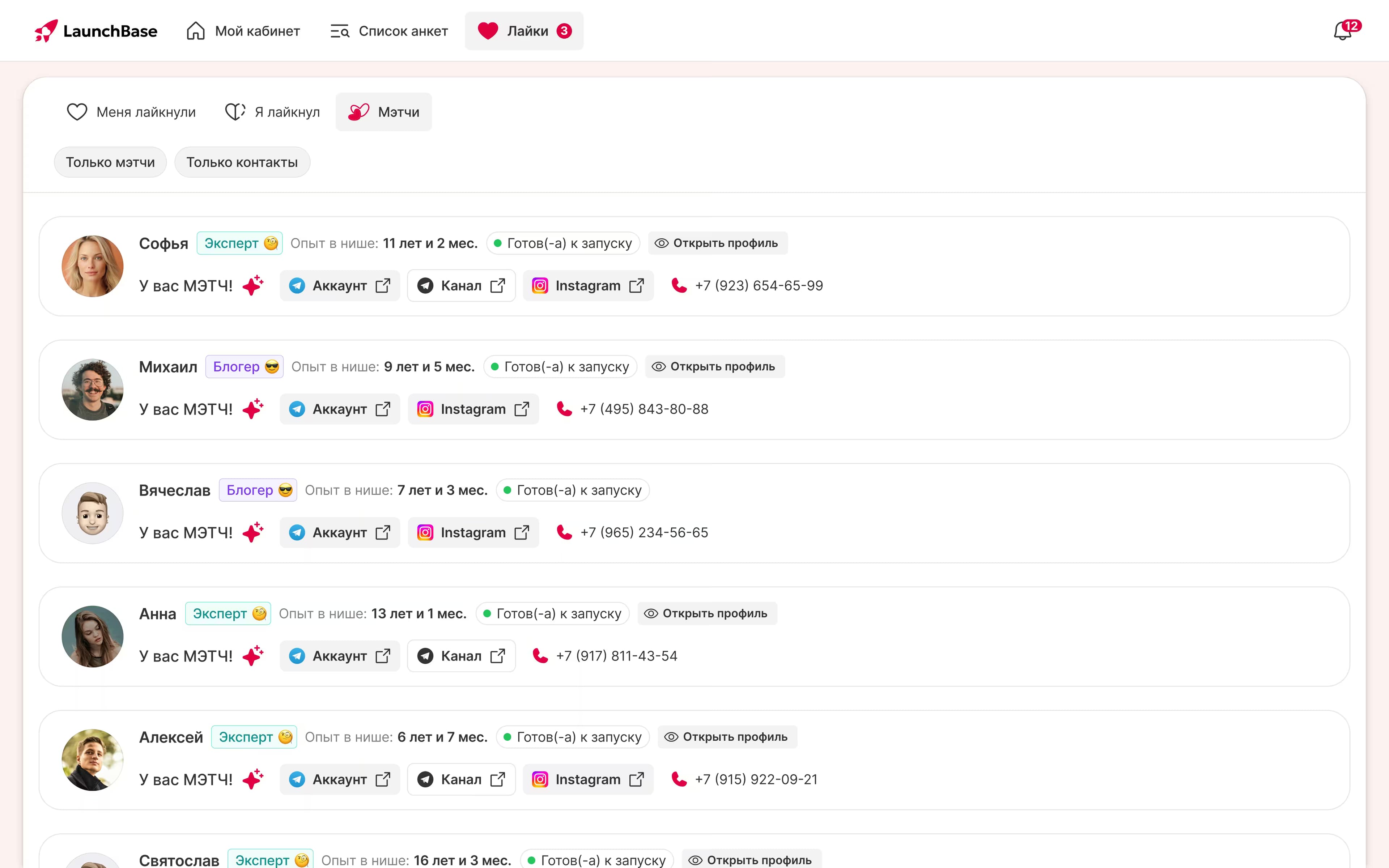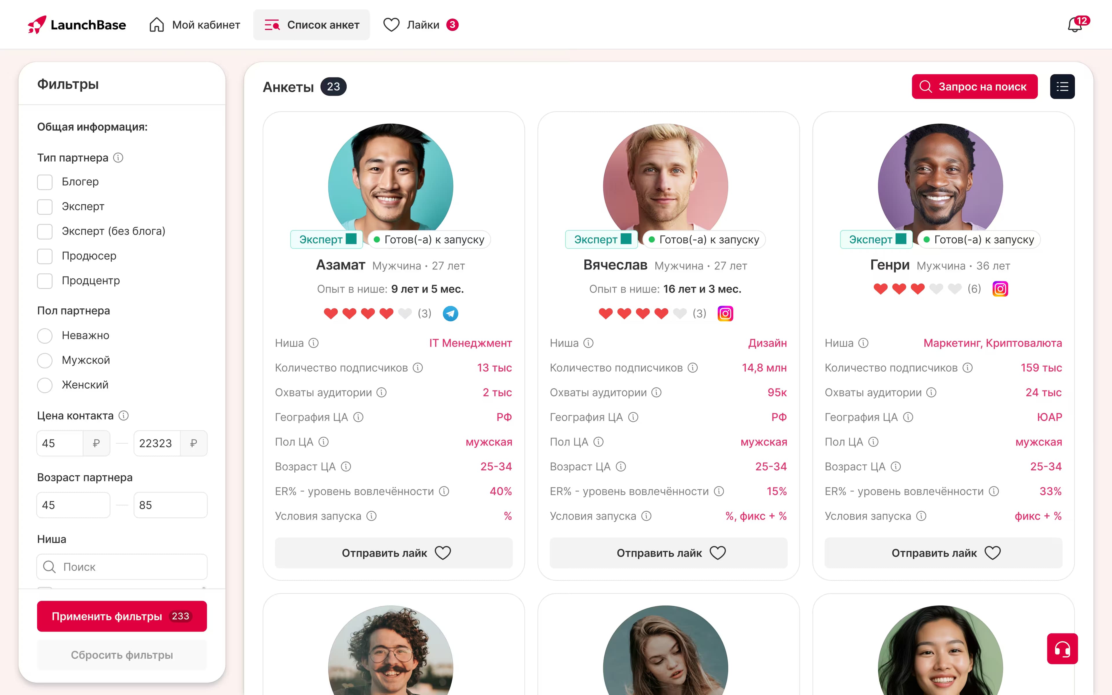 У каждого блогера, эксперта и продюсера своя уникальная анкета — опыт запусков, цели, условия сотрудничества и многое другое — каждая анкета проходит строгую модерацию, мы гарантируем защиту и достоверность данных.